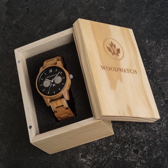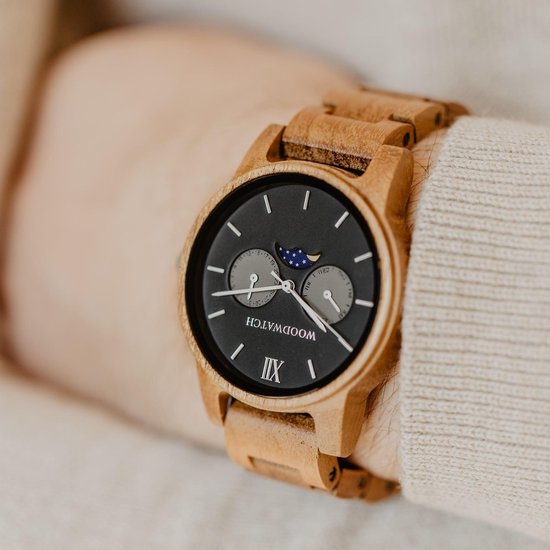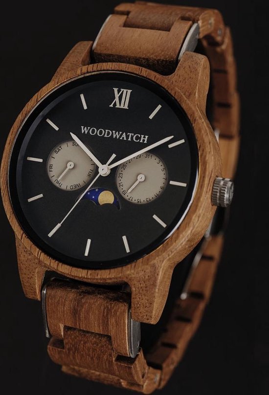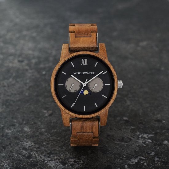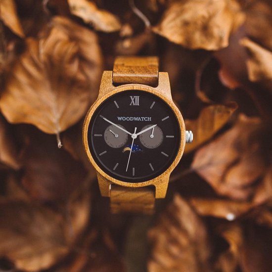 Stijlvol design, unieke maankalender De CLASSIC Collectie vernieuwt de esthetiek van een WoodWatch op een stijlvolle manier. De dunne behuizing heeft een klassieke uitstraling en kenmerkt zich met een maankalender uurwerk en twee extra subdials met week- en maandaanduiding. De CLASSIC Maverick is gemaakt van teakhout uit Oost-Azië en heeft een matzwarte wijzerplaat met zilveren details. Beschikbaar met een houten en een leren band.